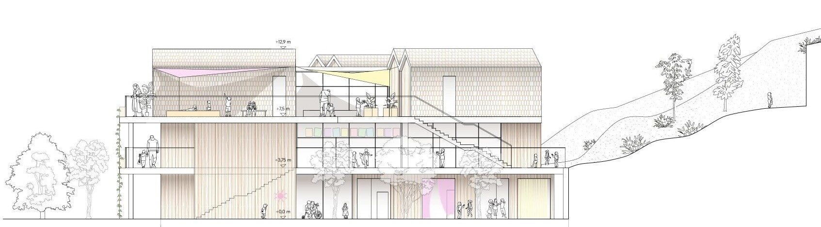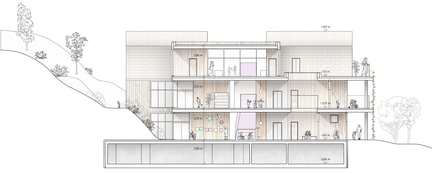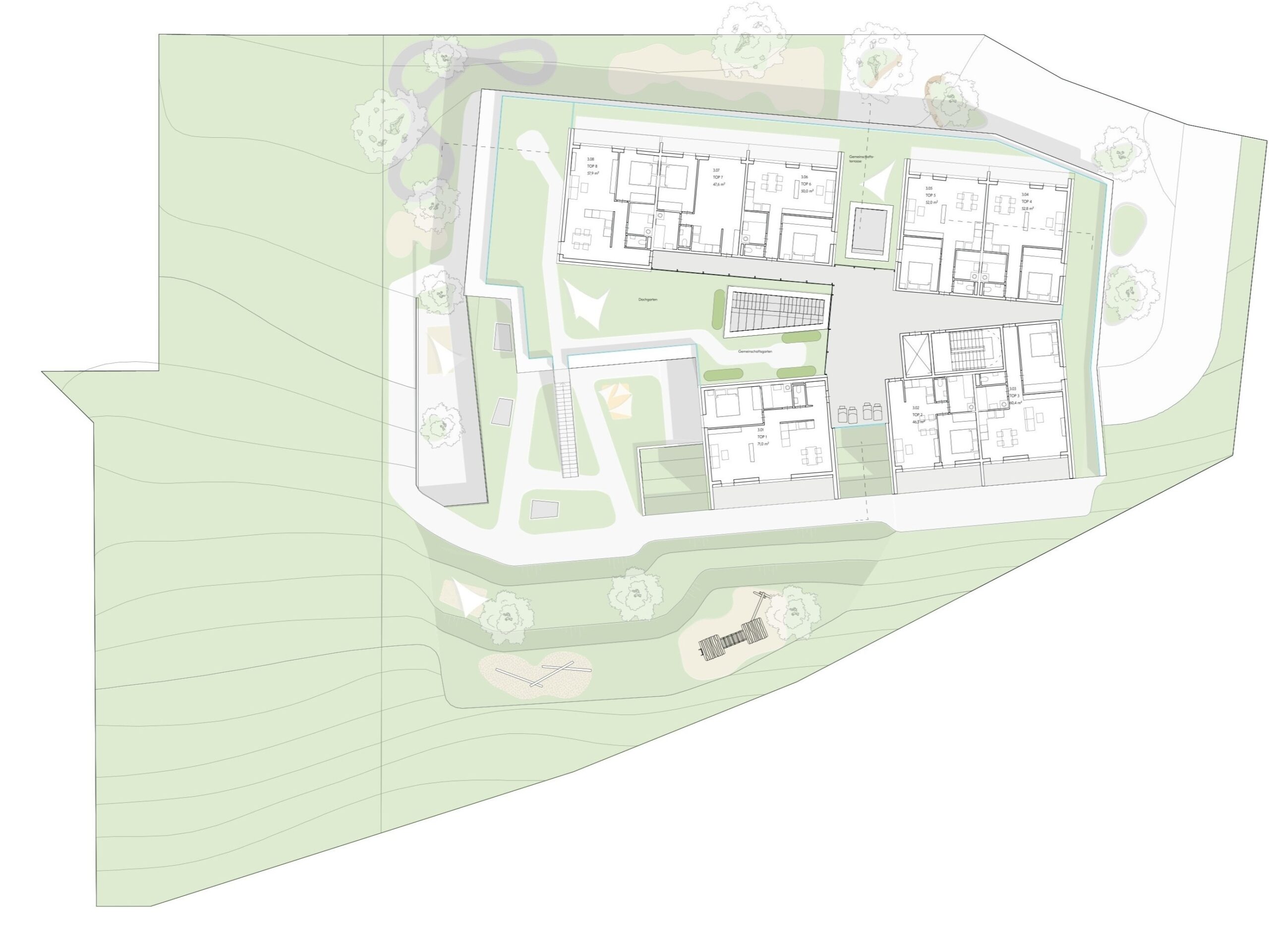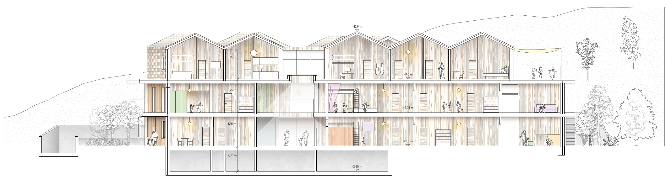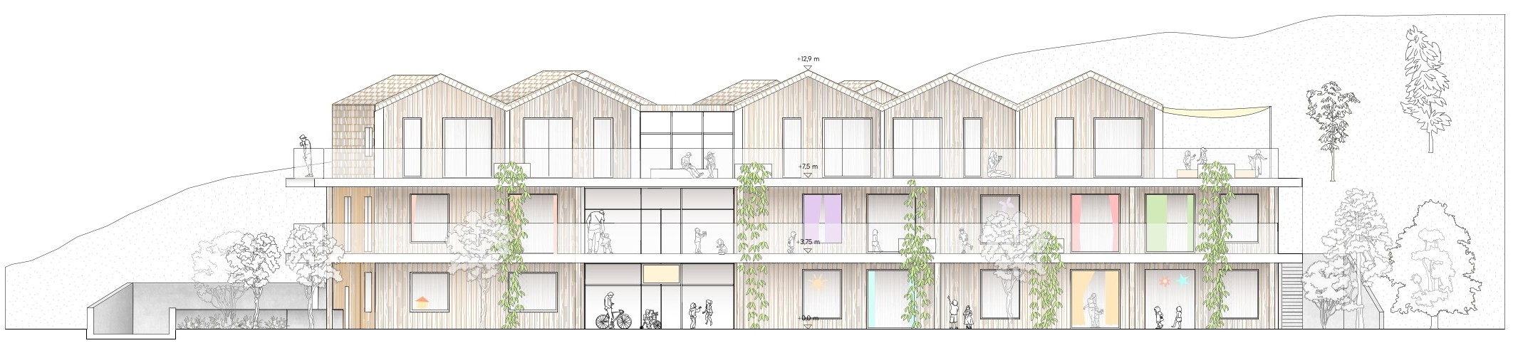Der Entwurf fügt sich harmonisch in die bestehende Ortsstruktur ein. Durch die Positionierung des Gebäudes entsteht ein einladender Vorplatz, der das öffentliche und private Leben verbindet. Die Höhenanpassung an die Nachbargebäude, regionale Dachformen und die Einbettung in die Hanglage stärken den Charakter des Ortskerns, während wichtige Freiflächen wie der Schlittenhügel erhalten bleiben.