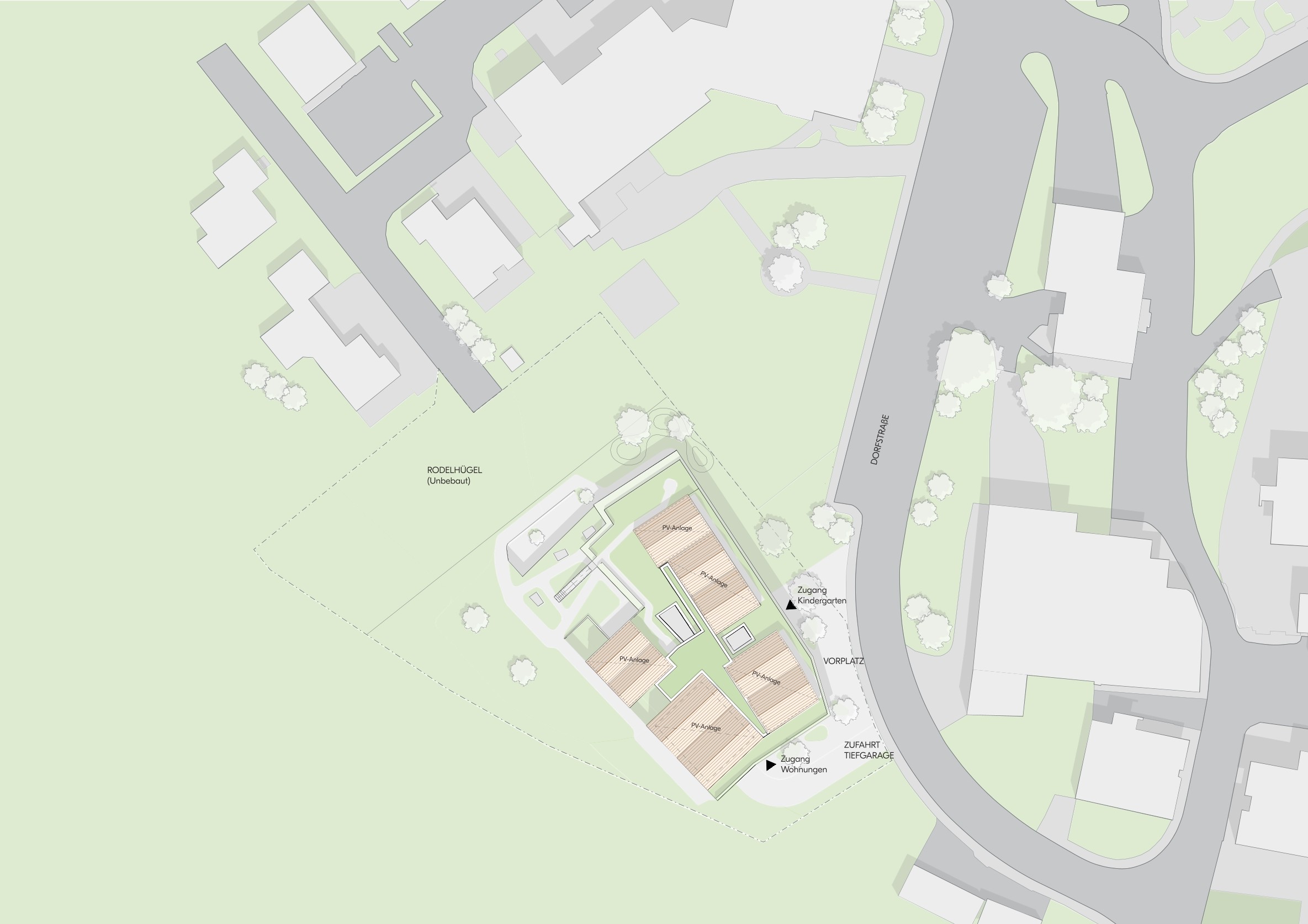 Der Entwurf fügt sich harmonisch in die bestehende Ortsstruktur ein. Durch die Positionierung des Gebäudes entsteht ein einladender Vorplatz, der das öffentliche und private Leben verbindet. Die Höhenanpassung an die Nachbargebäude, regionale Dachformen und die Einbettung in die Hanglage stärken den Charakter des Ortskerns, während wichtige Freiflächen wie der Schlittenhügel erhalten bleiben.
