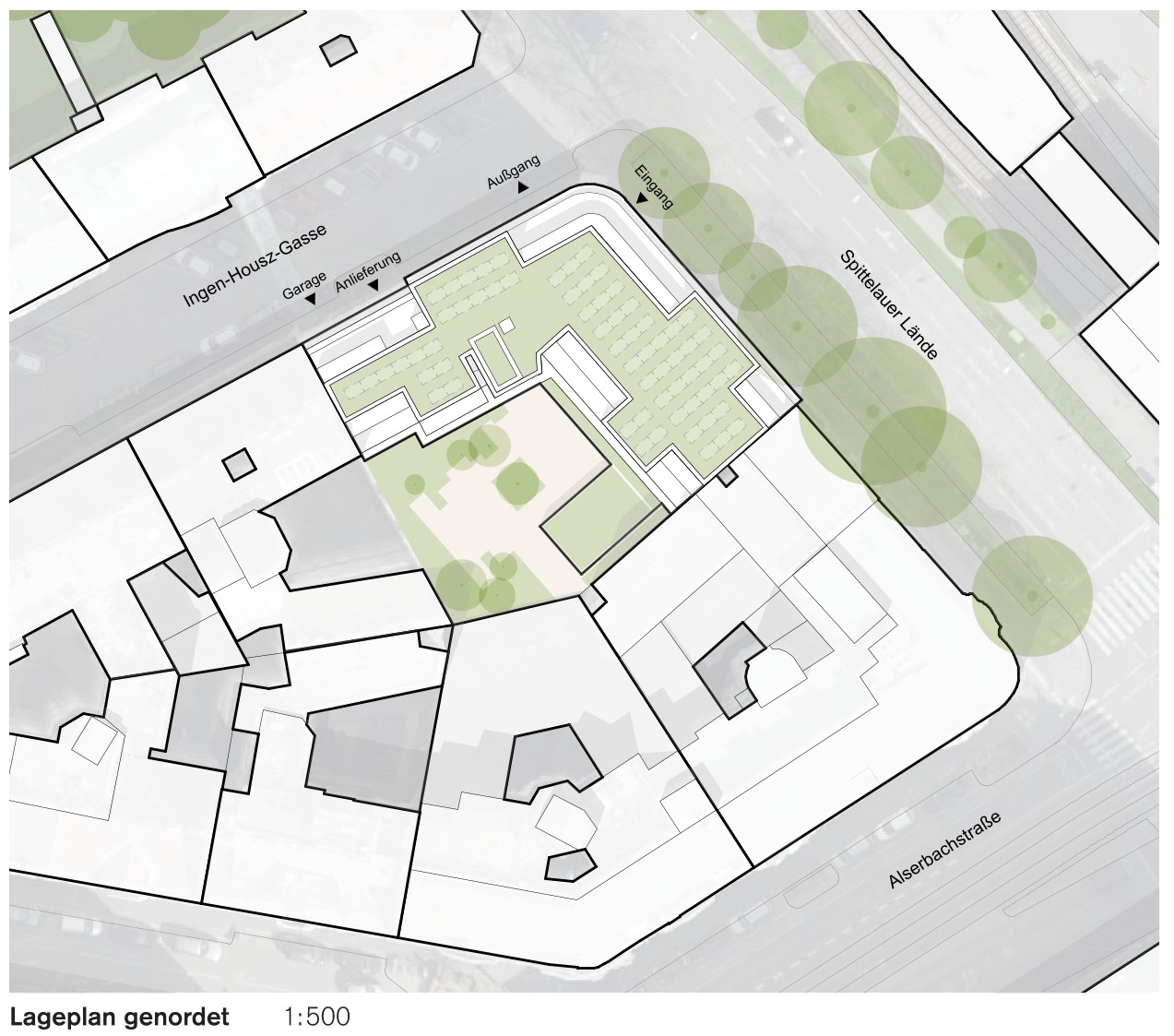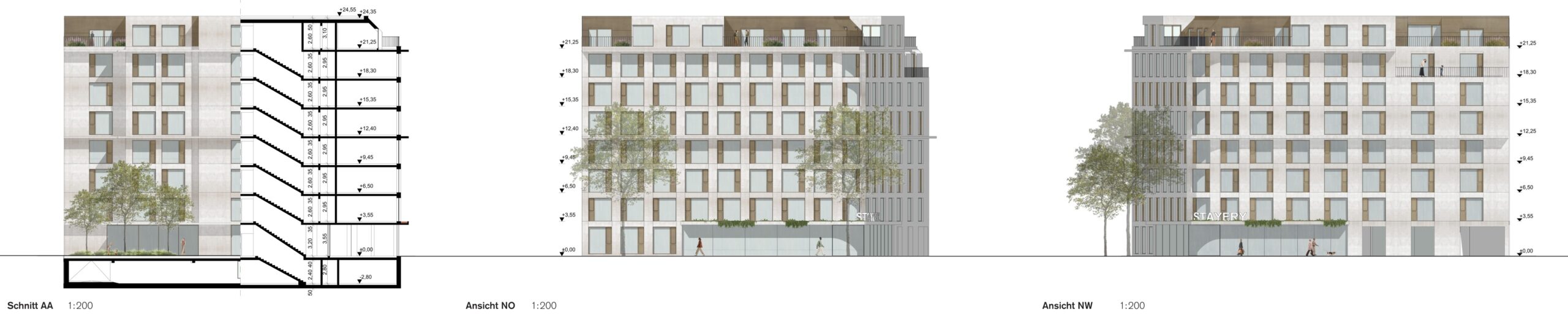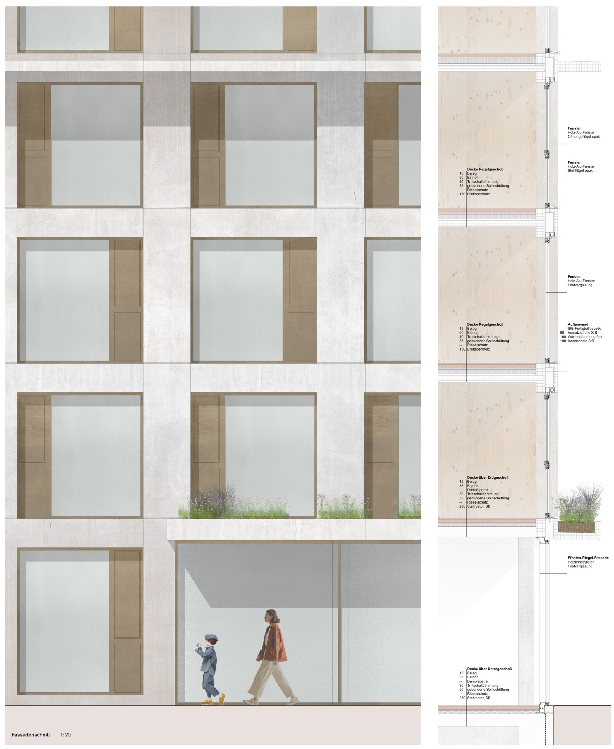 Wir drehen das übliche Bauprinzip um. Statt eines Stahlbetonskeletts mit leichter Holzfassade errichten wir einen massiven Holzbau aus Brettsperrholzwänden und -decken. Diese speichern aktiv CO₂ und reduzieren den ökologischen Fußabdruck deutlich. Die äußere Hülle bilden vorgefertigte Betonsandwichelemente, die gezielt eingesetzt werden, um Schallschutz, Dauerhaftigkeit und eine hochwertige Sichtbetonoptik zu gewährleisten. Durch den hohen Vorfertigungsgrad beider Materialien erzielen wir eine schnelle, präzise Bauweise mit minimalen Belastungen für das städtische Umfeld.