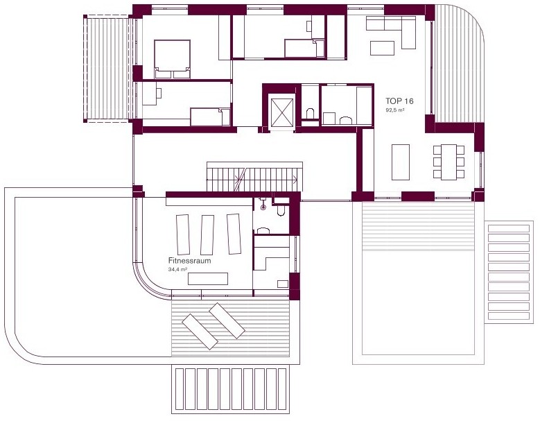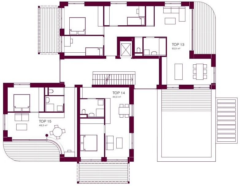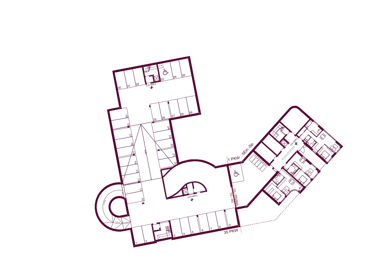 Zonierung – Die Anordnung ermöglicht eine klare Grundstückstrennung. Die Lage des freifinanzierten Baukörpers bietet freien Blick in die Weite (und ist auch eine Folge der Flugverbotszone). Bei der Konzeption der Tiefgarage wurde auf geringmögliche Bodenversiegelung geachtet.