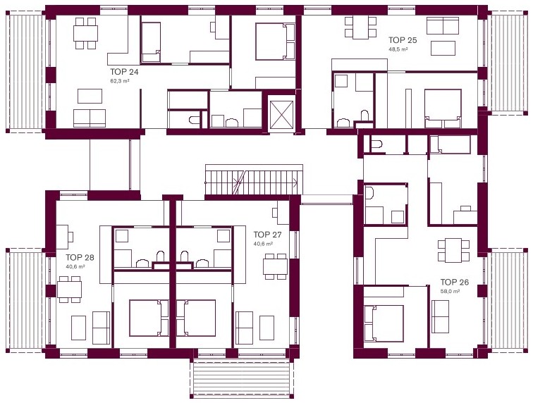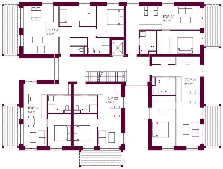 Warum Lüften? In den nächsten Jahrzehnten wird es noch viel öfter heißer werden – mit vielen Hitzetagen und Temperaturmaxima weit über 30°C. Die Ergebnisse des Forschungsprojektes „cool*buildings“ (Zukunftsagentur Bau, FH Salzburg, Donauuniversität Krems, ecoplus) zeigen, dass ein zentrales Qualitätskriterium von klimafitten Wohnbauten – bei den bis 2050 zu erwartenden Klimadaten – die Möglichkeit sein wird, querlüften zu können, um die Wohnungen in der Nacht abzukühlen. Die Studie zeigt auch, dass das Querlüften bei langanhaltenden Hitzeperioden noch relevanter ist als außenliegender Sonnenschutz. Sogar die Art der Bauweise und die Sorge hinsichtlich fehlender Speichermaßen im Holzbau verlieren ihre Relevanz – wenn man in der Nacht gut lüften kann. Darum haben wir die Baukörper so konzipiert, dass alle Wohnungen gut gelüftet werden können.