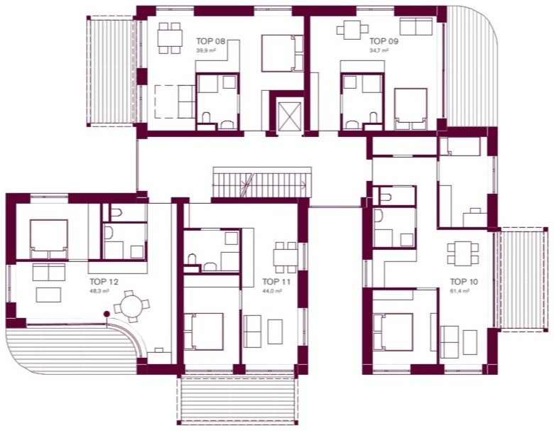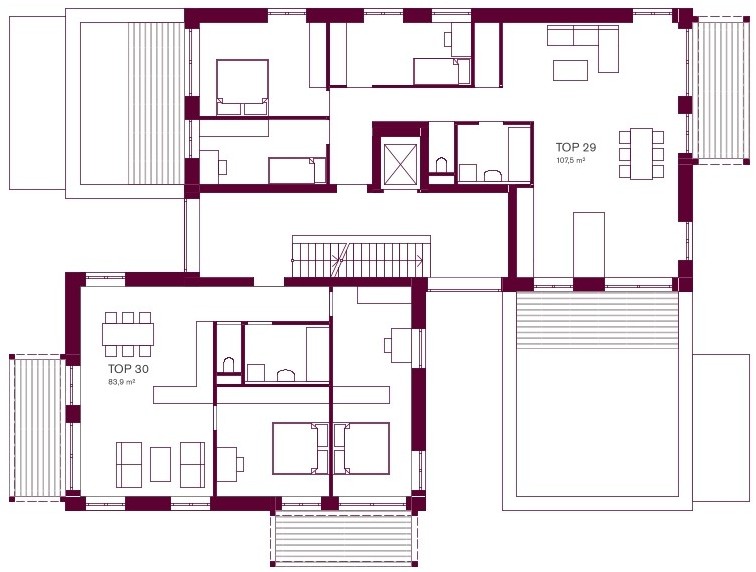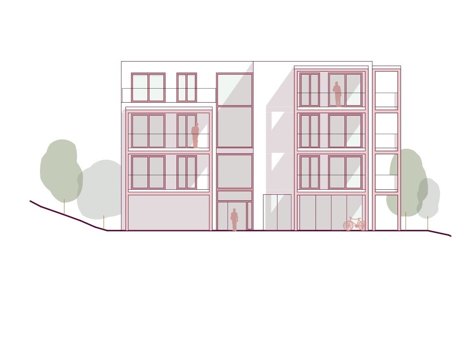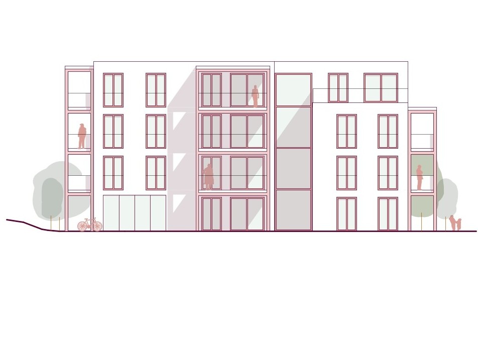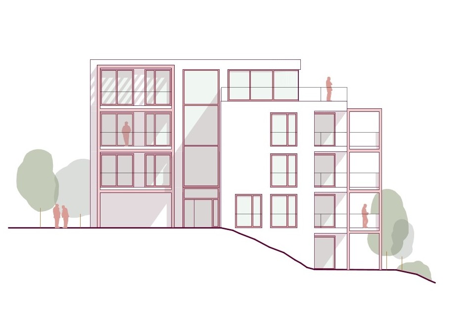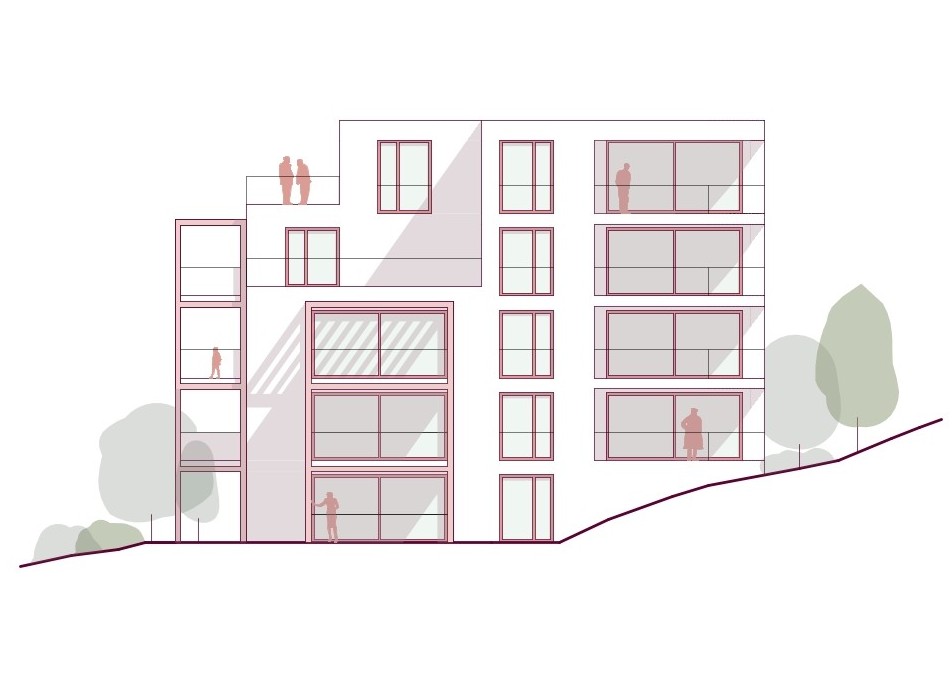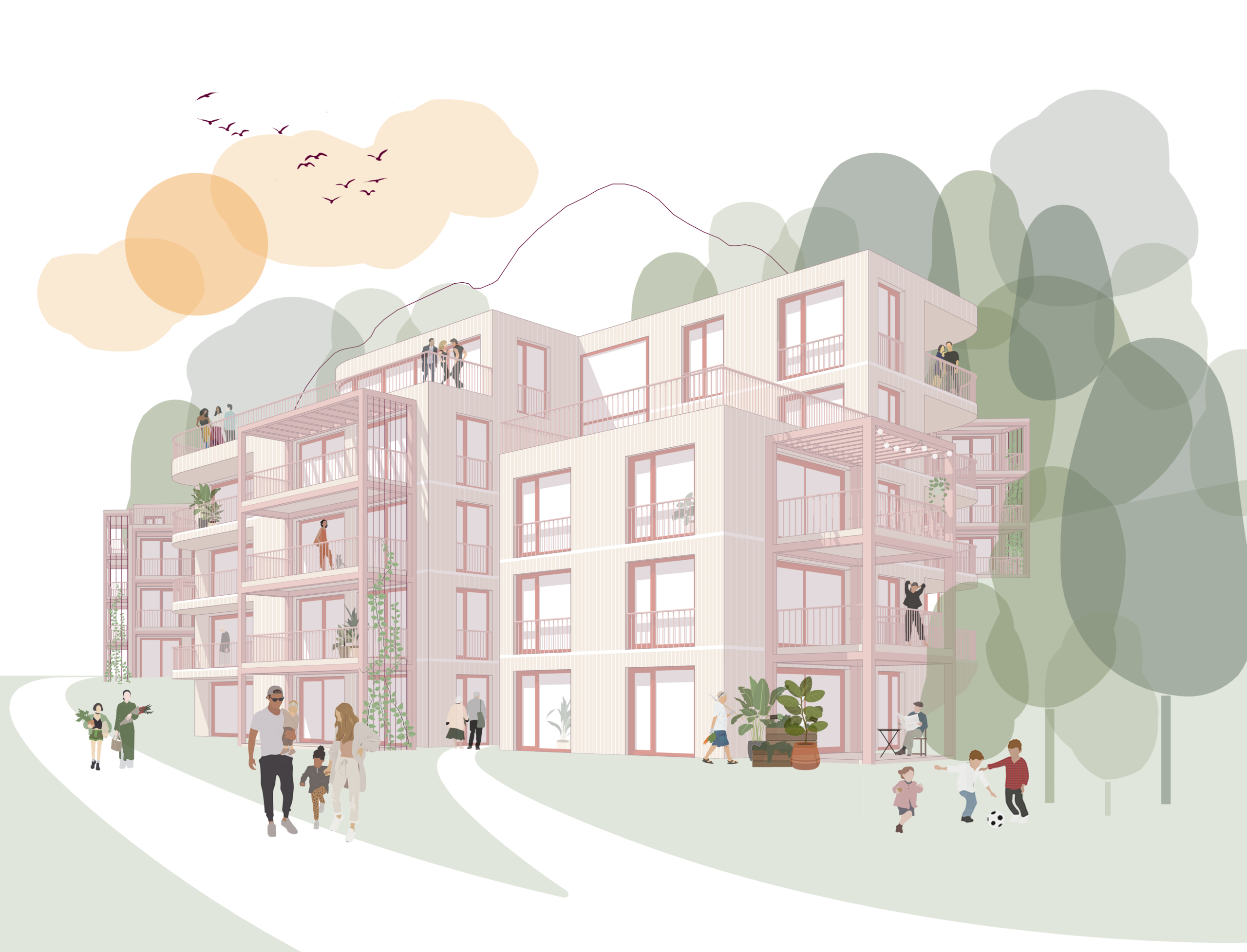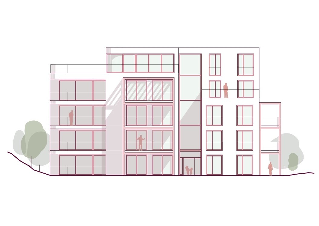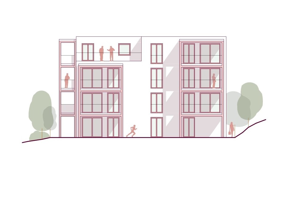 Gemeinschaft – Die durch Höhenstaffelung und Einschnitte gegliederten Baukörper fügen sich gut in die Körnung der Umgebung ein. Die Situierung am Grundstück fasst einen zentralen Freiraum als belebten Treffpunkt für die Bewohner:innen.