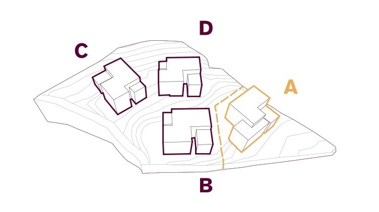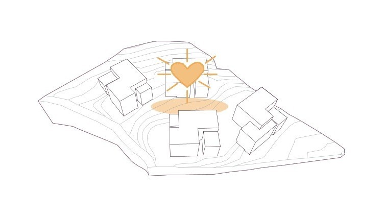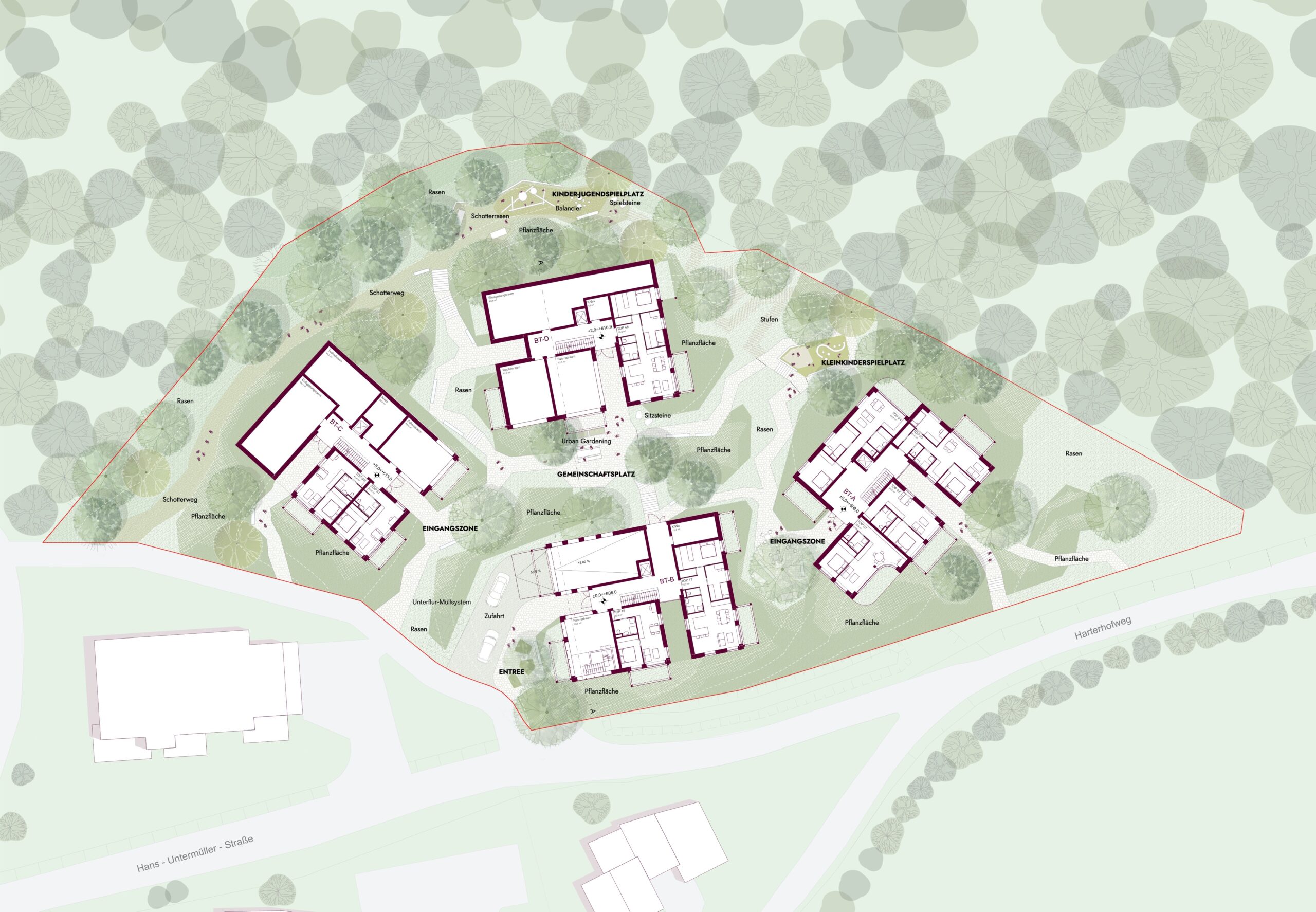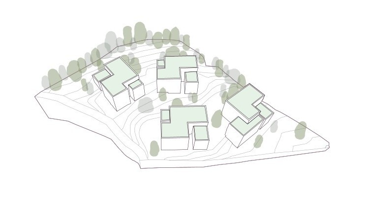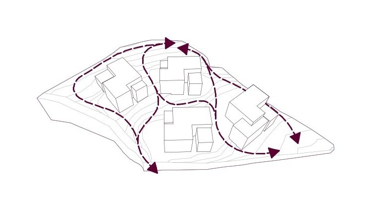 Netzwerk – Ein wesentlicher Gestaltungsaspekt des Entwurfs ist die Verbindung der Anlage mit dem nördlich angrenzenden Waldraum sowie ihre minimale Anpassung an das geneigte Gelände. Wege entlang der Höhenlinien sichern einen natürlichen, barrierefreien Zugang zu den Baukörpern.